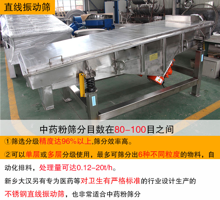 直線振動篩對于粉狀、顆粒狀的物料均可篩選、分級、除雜,對于固液混合物體可進行粗濾,篩選分級精度達96%以上,篩分效率高??梢?span style="color:#ff8c00;">單層或多層分級使用,多可篩分出6種不同粒度的物料,自動化排料,處理量可達0.12-20t/h。新鄉(xiāng)大漢不銹鋼直線振動篩是專為醫(yī)藥等對衛(wèi)生有嚴格標準的行業(yè)設計生產(chǎn)的,該設備不僅能夠?qū)崿F(xiàn)對中藥粉的分級篩選功能,而且在重要原材料的除雜方面也有很好的表現(xiàn),只需根據(jù)篩分需求的不同對中藥粉振動篩的篩網(wǎng)進行更換即可實現(xiàn)。