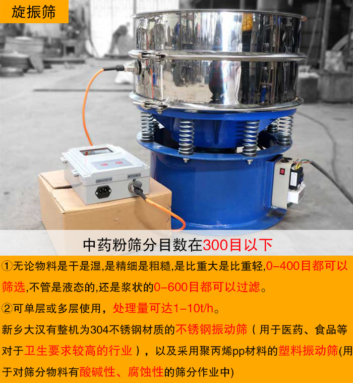 另外大漢旋振篩還有整機為304不銹鋼材質(zhì)的不銹鋼振動篩,主要用于醫(yī)藥、食品等對于衛(wèi)生要求較高的行業(yè),以及采用聚丙烯pp材料的塑料振動篩,用于篩分物料有酸堿性、腐蝕性的篩分作業(yè)中。