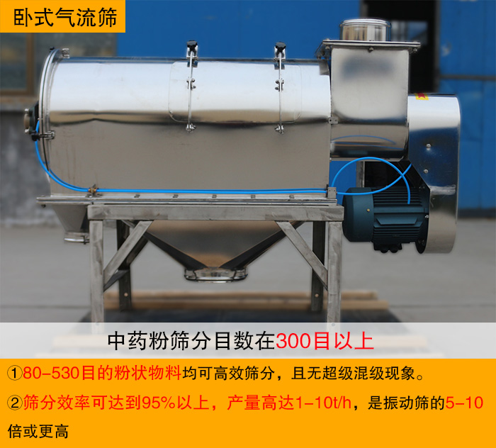 中藥粉篩分目數(shù)在300目以上,在篩分過程中容易造成粉塵飛揚,使中藥粉粘附在篩網(wǎng)上造成堵網(wǎng)現(xiàn)象,所以建議大家選用氣旋篩。