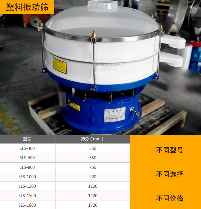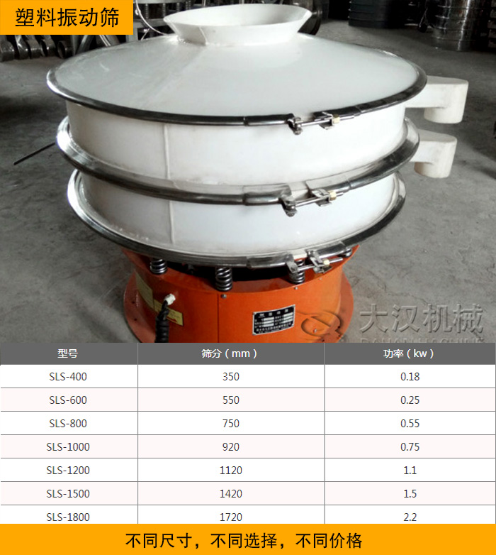 不同型號的塑料振動篩,其價格是不同的。大漢塑料振動篩型號有SLS-400,SLS-600,SLS-800,SLS-1000,SLS-1200,SLS-1400,SLS-1500,SLS-1800。不同型號的塑料振動篩單位時間內處理能力也不一樣。SLS-400塑料振動篩的篩分直徑為350mm,而SLS-1800塑料振動篩的篩分直徑為1720mm,這就造成兩種型號的塑料振動篩處理能力上具有差異化,因此,這需要根據用戶的要求進行合理選型與設計。