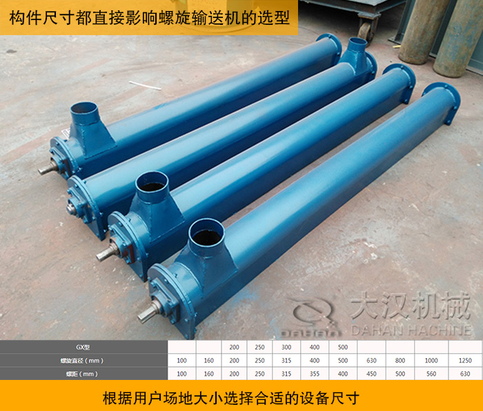 輸送機(jī)的構(gòu)件尺寸包括管道直徑大小(管式螺旋輸送機(jī))或者槽體的寬度、深度,進(jìn)料斗的尺寸大小等。這些構(gòu)件尺寸都直接影響螺旋輸送機(jī)的輸送能力。還要考慮用戶場地的空間還有安放的問題,根據(jù)用戶場地大小選擇合適的設(shè)備尺寸。