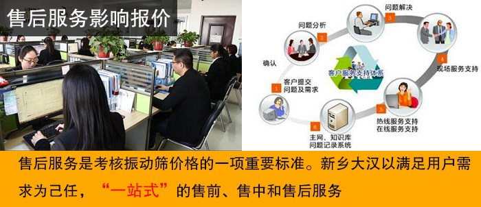 售后服務(wù)是考核振動篩價格的一項重要標準。但話說回來售后服務(wù)也只有合作了才知道。但我們在購買前期可以通過視頻、圖片、實地考察等形式來判斷該企業(yè)是否具有生產(chǎn)能力及售后服務(wù),新鄉(xiāng)大漢以滿足用戶需求為己任,“一站式”的售前、售中和售后服務(wù),不斷對用戶體驗進行改善和提升,以優(yōu)質(zhì)的品質(zhì)和周全的服務(wù)贏得了國內(nèi)外用戶的一致好評,現(xiàn)有用戶已遍布全球30多個國家,設(shè)備保修期為1年。