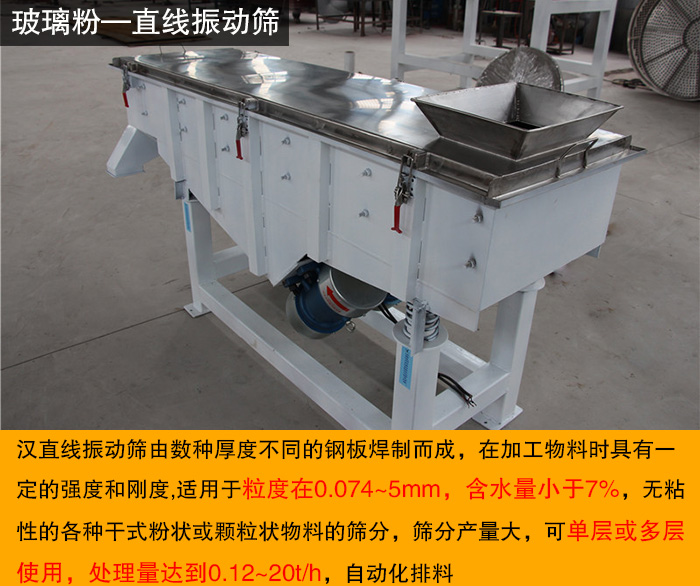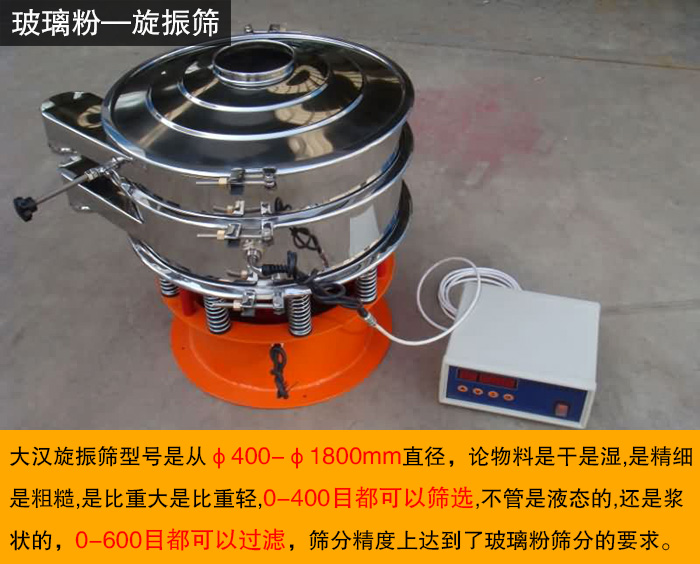 玻璃粉是一種白色粉末狀物料,在日常生活中應(yīng)用廣泛,主要用于生產(chǎn)高檔家具的水晶底漆或裝修時使用。而在玻璃粉實際生產(chǎn)過程中,經(jīng)常要使用振動篩對玻璃粉進行除雜、分級和篩選,由于玻璃粉比重大,具有良好的透篩率,根據(jù)玻璃粉粒度要求(8mm~0.106mm之間)、篩分目數(shù)(2~150目之間)及用戶對篩分精度、篩分產(chǎn)量的要求不同,常見的用于玻璃粉篩分的振動篩主要有旋振篩、超聲波振動篩以及直線振動篩等3種。接下來大漢小編將為您介紹著三款振動篩在篩分玻璃粉的不同之處,方便用戶選擇出適合自己的玻璃粉篩分設(shè)備。