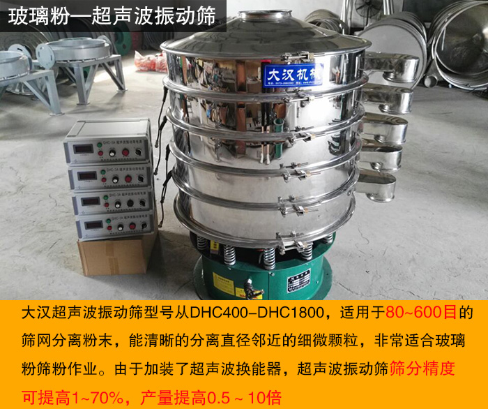 新鄉(xiāng)大漢超聲波振動篩型號從DHC400-DHC1800,適用于80~600目的篩網(wǎng)分離粉末,能清晰的分離直徑鄰近的細微顆粒,非常適合玻璃粉篩粉作業(yè)。由于加裝了超聲波換能器,超聲波振動篩篩分精度可提高1~70%,產(chǎn)量提高0.5~10倍,真正解決了強吸附性、易抱團、粘性強、高靜電、高密度、超細粉體等特性物料的篩分難題。超聲波振動篩價格主要由材質(zhì)(碳鋼/不銹鋼)、型號等決定。