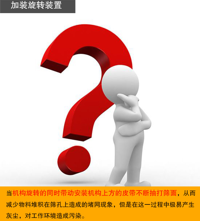 滾筒篩在其固定機架上加裝帶皮帶的旋轉(zhuǎn)裝置,當機構(gòu)旋轉(zhuǎn)的同時帶動安裝機構(gòu)上方的皮帶不斷抽打篩面,從而減少物料堆積在篩孔上造成的堵網(wǎng)現(xiàn)象,但是在這一過程中極易產(chǎn)生灰塵,對工作環(huán)境造成污染。
