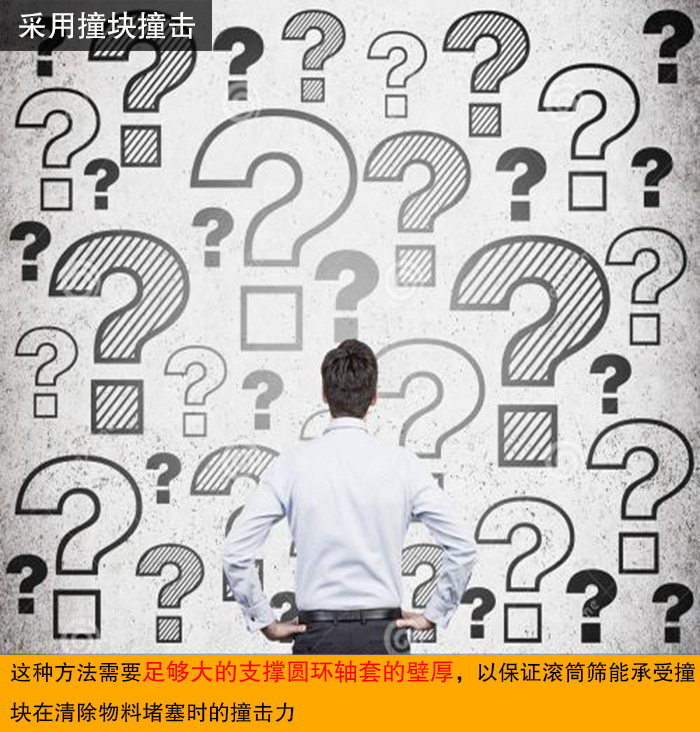 滾筒篩堵網(wǎng)還可以采用撞塊撞擊,但是這種方法需要足夠大的支撐圓環(huán)軸套的壁厚,以保證滾筒篩能承受撞塊在清除物料堵塞時的撞擊力。