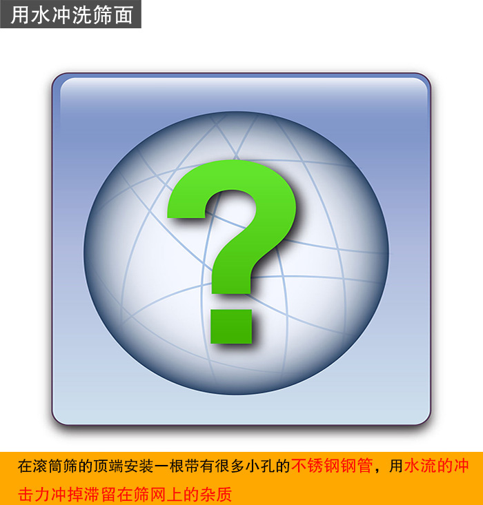 還可以在滾筒篩的頂端安裝一根帶有很多小孔的不銹鋼鋼管,用水流的沖擊力沖掉滯留在篩網(wǎng)上的雜質(zhì)。