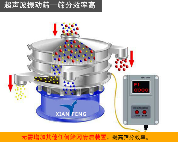 由于配備專(zhuān)用的超聲波篩分系統(tǒng),使篩面在做三次元運(yùn)動(dòng)的同時(shí)還有一個(gè)高頻率低振幅的超聲振動(dòng)波,使物料低空懸浮在篩面,還可保證所篩物料特性不變,超聲波振動(dòng)篩由于有超聲振動(dòng)波的存在,無(wú)需增加其他篩網(wǎng)清理裝置,提高篩分效率。