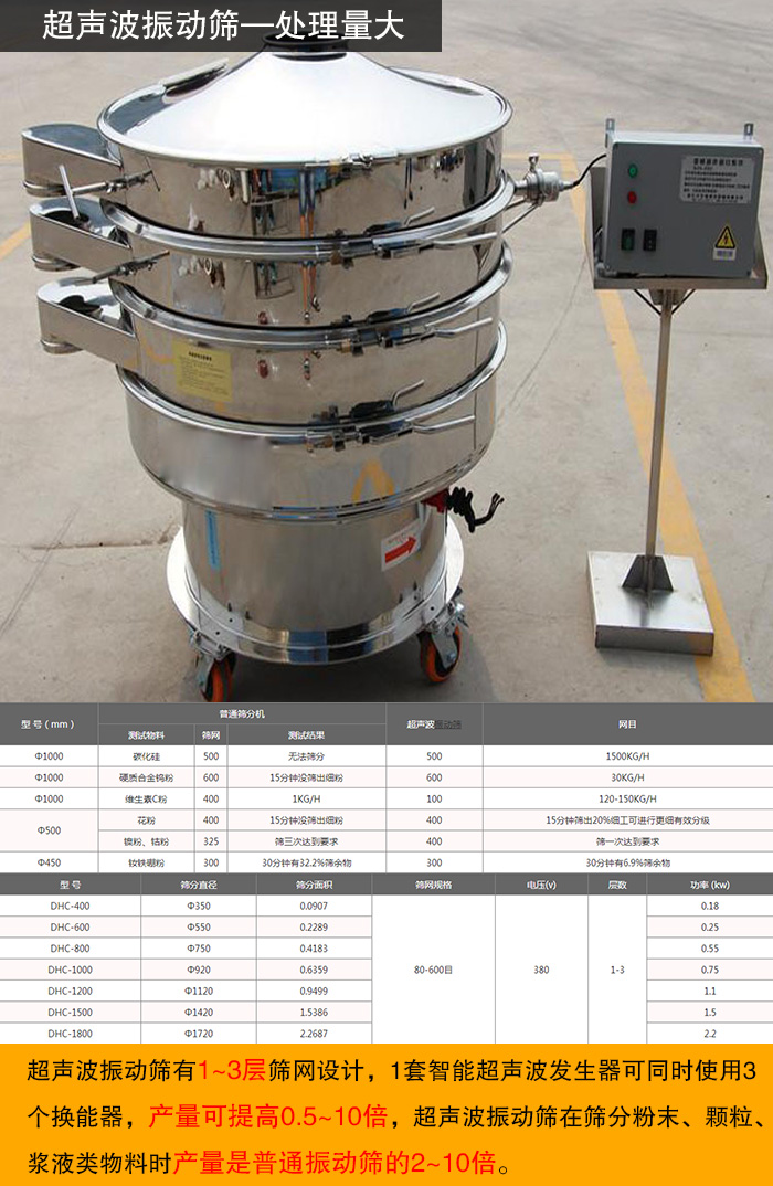 超聲波振動(dòng)篩有1~3層篩網(wǎng)設(shè)計(jì),1套智能超聲波發(fā)生器可同時(shí)使用3個(gè)換能器,產(chǎn)量可提高0.5~10倍,超聲波振動(dòng)篩在篩分粉末、顆粒、漿液類(lèi)物料時(shí)產(chǎn)量是普通振動(dòng)篩的2~10倍。