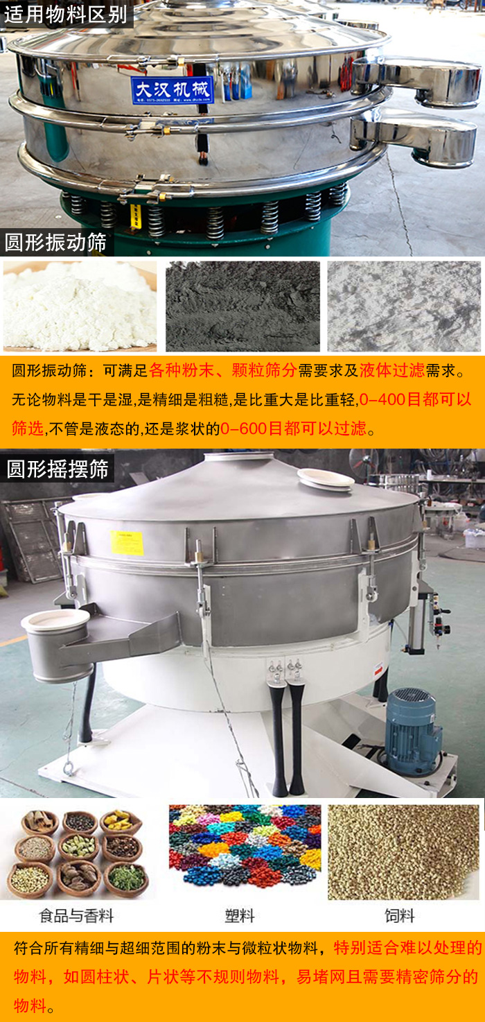 圓形搖擺篩符合所有精細(xì)與超細(xì)范圍的粉末與微粒狀物料,特別適合難以處理的物料,如圓柱狀、片狀等不規(guī)則物料,易堵網(wǎng)且需要精密篩分的物料。