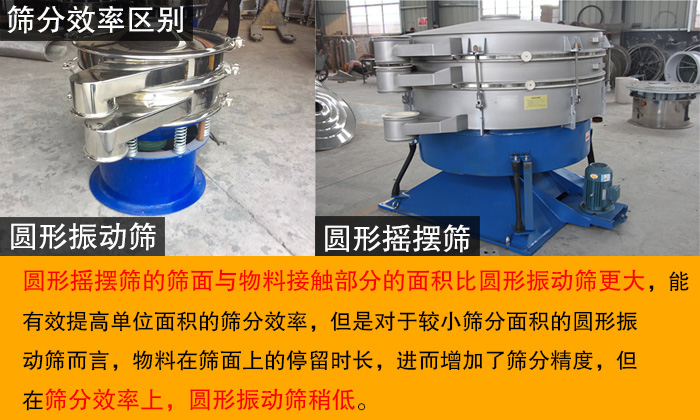 圓形搖擺篩的篩面與物料接觸部分的面積比圓形振動(dòng)篩更大,能有效提高單位面積的篩分效率,但是對(duì)于較小篩分面積的圓形振動(dòng)篩而言,物料在篩面上的停留時(shí)長(zhǎng),進(jìn)而增加了篩分精度,但在篩分效率上,圓形振動(dòng)篩稍低。