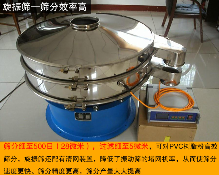 旋振篩可以篩分過(guò)濾顆粒,細(xì)粉,漿液的物料,既可粗略分級(jí),又可精細(xì)篩分或者過(guò)濾,篩分效率高,根據(jù)實(shí)際生產(chǎn)需要可單層或多層使用,全封閉結(jié)構(gòu),無(wú)粉塵溢散,篩網(wǎng)不阻塞、粉末不飛揚(yáng)、篩分細(xì)至500目(28微米),過(guò)濾細(xì)至5微米,可對(duì)PVC樹(shù)脂粉高效篩分,旋振篩還配有清網(wǎng)裝置,降低了振動(dòng)篩的堵網(wǎng)機(jī)率,從而使篩分速度更快、篩分精度更高,篩分產(chǎn)量大大提高。