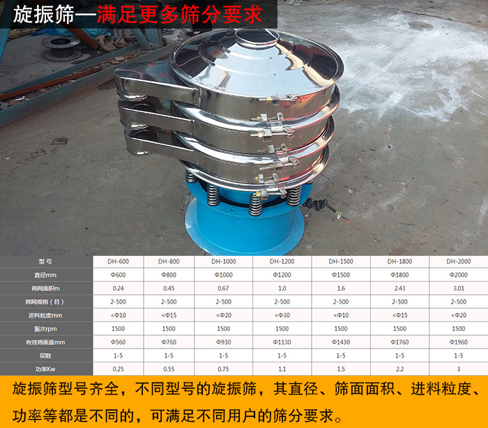 旋振篩型號(hào)從DH-600、DH-800、DH-1000、DH-1200、DH-1500、DH-1800、DH-2000,不同型號(hào)的旋振篩,其直徑、篩面面積、進(jìn)料粒度、功率等都是不同的,可滿足不同用戶的篩分要求。