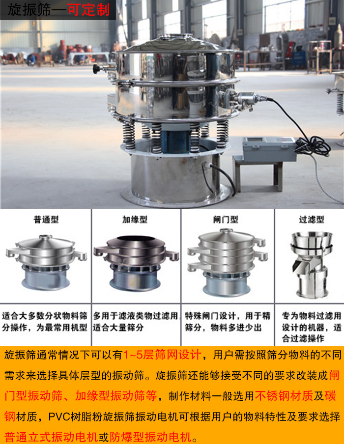 通常情況下,旋振篩通常情況下可以有1~5層篩網(wǎng)設(shè)計(jì),用戶需按照篩分物料的不同需求來(lái)選擇具體層型的振動(dòng)篩。旋振篩還能夠接受不同的要求改裝成閘門型振動(dòng)篩、加緣型振動(dòng)篩等,制作材料一般選用不銹鋼材質(zhì)及碳鋼材質(zhì),PVC樹(shù)脂粉旋振篩振動(dòng)電機(jī)可根據(jù)用戶的物料特性及要求選擇普通立式振動(dòng)電機(jī)或防爆型振動(dòng)電機(jī)。
