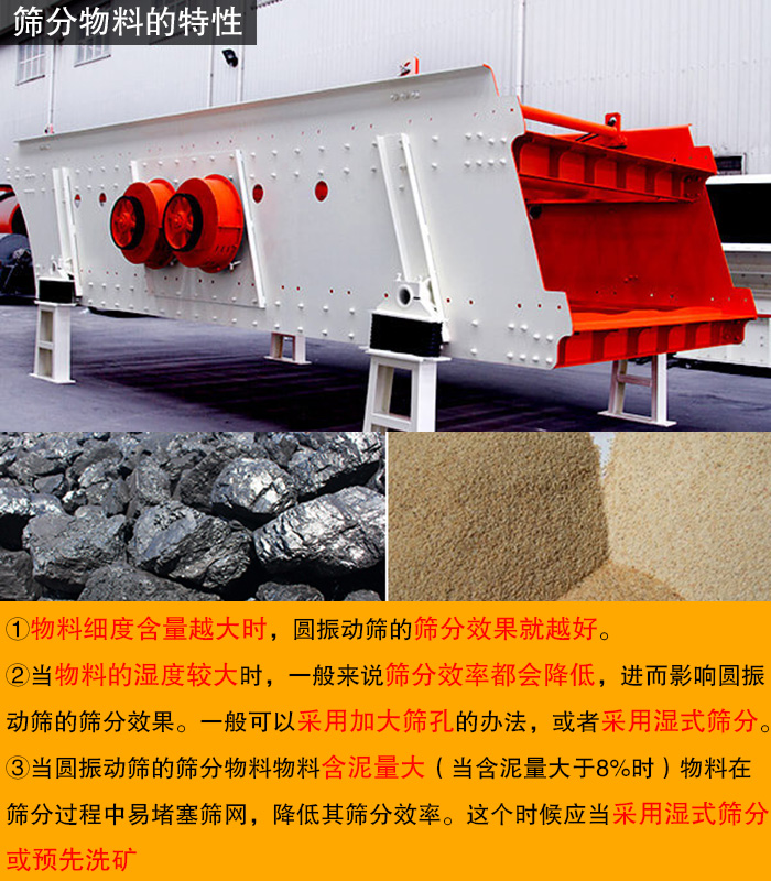 ①圓振動(dòng)篩為礦用振動(dòng)篩,所以篩分的物料大都是煤、礦等顆粒狀或大塊狀物料,但是只有物料細(xì)度含量越大時(shí),圓振動(dòng)篩的篩分效果就越好。