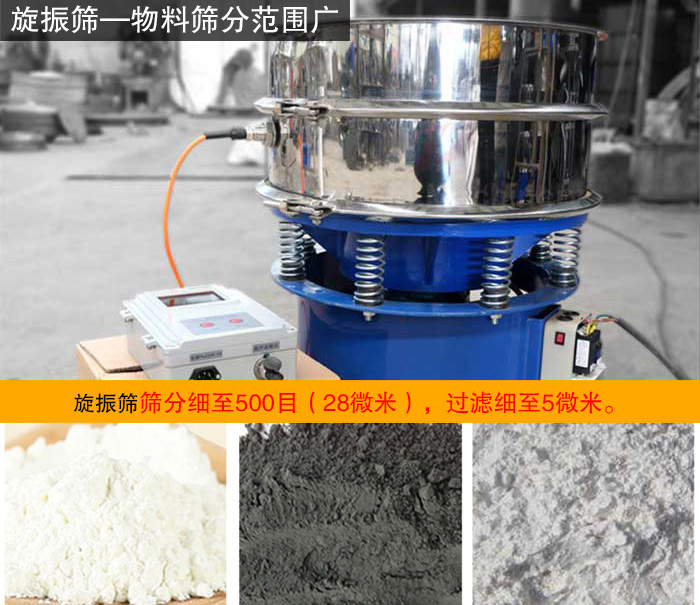旋振篩可以篩分過濾顆粒,細(xì)粉,漿液的物料,既可粗略分級(jí),又可精細(xì)篩分或者過濾,篩分效率高,根據(jù)實(shí)際生產(chǎn)需要可單層或多層使用,全封閉結(jié)構(gòu),無粉塵溢散,篩網(wǎng)不阻塞、粉末不飛揚(yáng)、篩分細(xì)至500目(28微米),過濾細(xì)至5微米。可對(duì)氧化鋅粉末高效篩分。