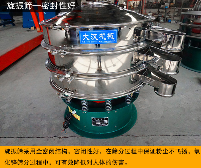 旋振篩密閉性好,在篩分過程中保證粉塵不飛揚(yáng),氧化鋅篩分過程中,可有效降低對(duì)人體的傷害。