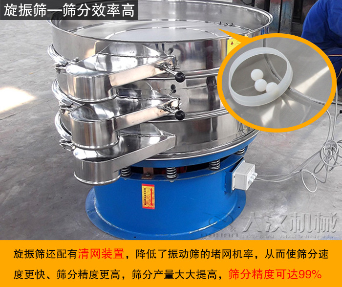 旋振篩型號(hào)從DH-600、DH-800、DH-1000、DH-1200、DH-1500、DH-1800、DH-2000,不同型號(hào)的旋振篩,其直徑、篩面面積、進(jìn)料粒度、功率等都是不同的,可滿足不同用戶的篩分要求, 大漢旋振篩有1~5層篩網(wǎng),雜質(zhì)、粗料自動(dòng)排出,可以連續(xù)作業(yè)。