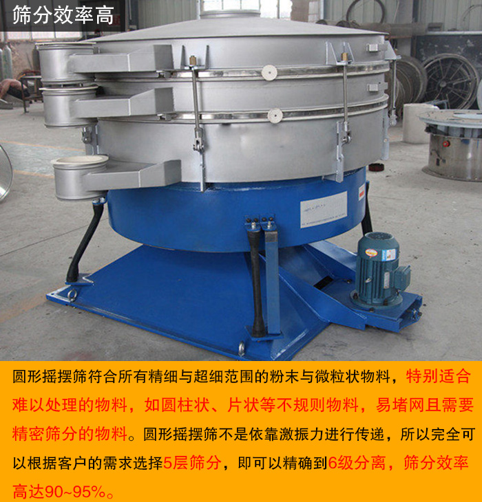 圓形搖擺篩符合所有精細(xì)與超細(xì)范圍的粉末與微粒狀物料,特別適合難以處理的物料,如圓柱狀、片狀等不規(guī)則物料,易堵網(wǎng)且需要精密篩分的物料。圓形搖擺篩不是依靠激振力進(jìn)行傳遞,所以完全可以根據(jù)客戶的需求選擇5層篩分,篩分效率高達(dá)90~95%。