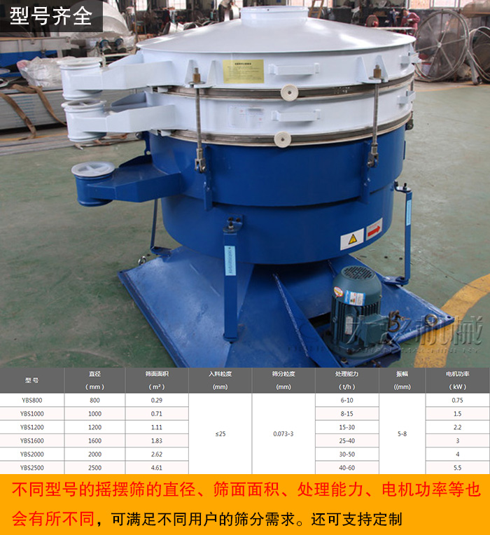 圓形搖擺篩主要型號(hào)有YBS-800、YBS-1000、YBS-1200、YBS-1600、YBS-1800、YBS-2000、YBS-2500,不同型號(hào)的搖擺篩的直徑、篩面面積、處理能力、電機(jī)功率等也會(huì)有所不同,可滿足不同用戶的篩分需求。還可支持定制。